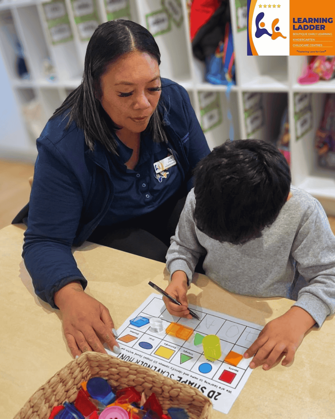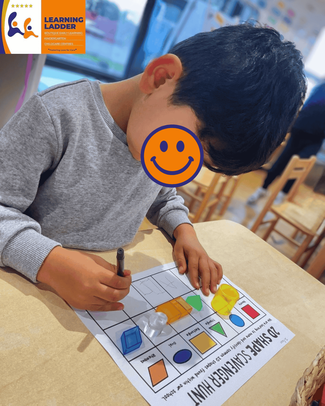We also explored shapes through an interactive scavenger hunt, where children searched the room for objects that matched the shapes on their worksheet before drawing them independently. This activity encouraged observation, problem-solving, and fine motor development while reinforcing their understanding of basic shape concepts in a fun and meaningful way.